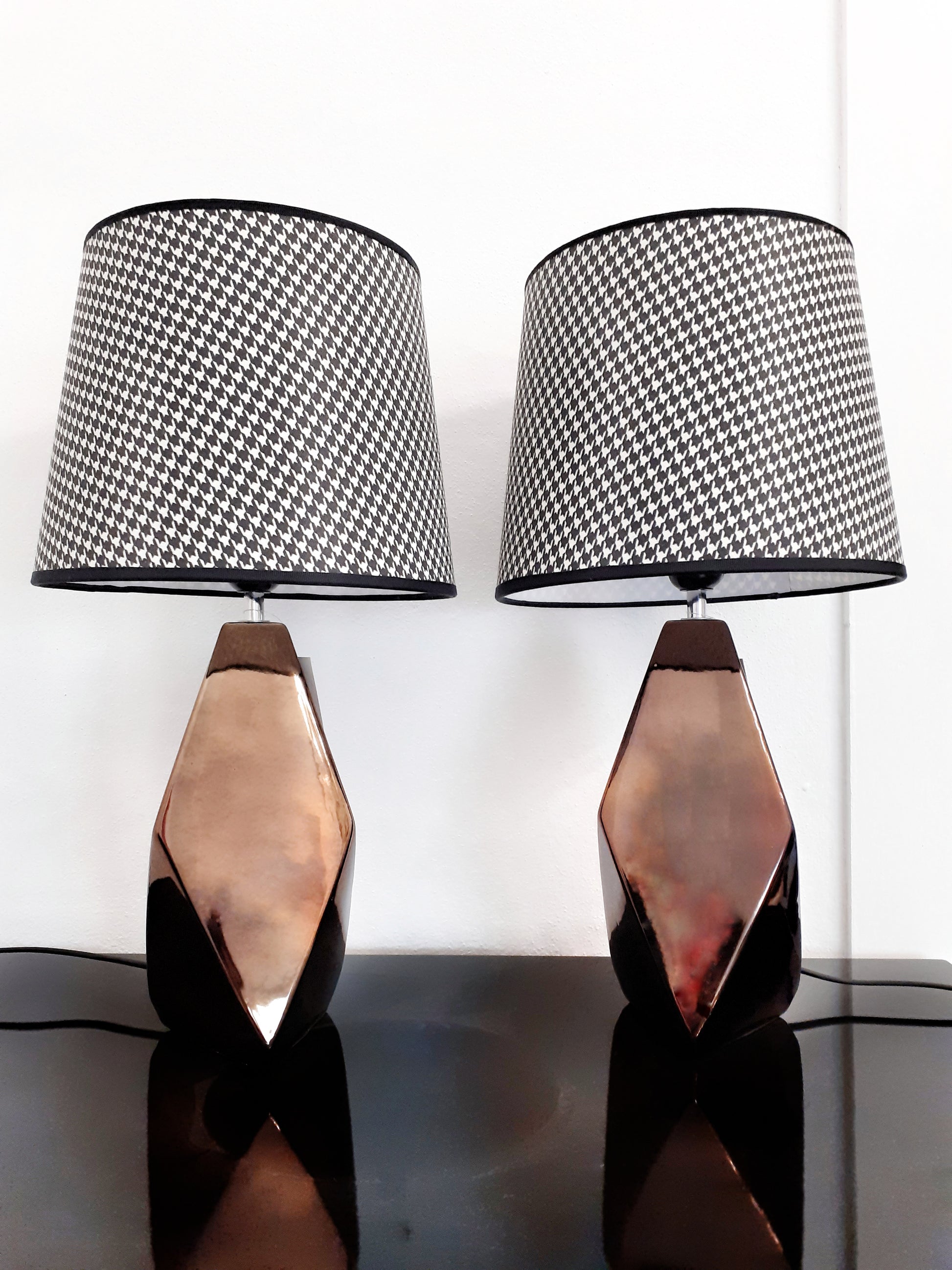 Set composto da due stupende lampade da tavolo PRISMA in ceramica dipinta a mano color bronzo, corredate da paralumi in tessuto a fantasia pied de poule realizzati da sapienti artigiani maestri pugliesi. Pezzi unici eleganti ed essenziali, contemporanei e al di sopra delle tendenze. Conferiranno al tuo ambiente una luce calda, morbida e avvolgente.